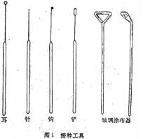 真菌转接需使用的接种工具为接种钩、铲,其样式大小见图1。制造的金属可用铂丝或镍丝,也可使用电炉丝,原则是软硬度适当,能经受反复火焰烧红。接种真菌的接种钩、铲,其丝的直径以1毫米比较适合。步骤:右手执针(铲、钩等),左手执管,烧针灭菌,拔塞烧口,挑菌移植,烧口塞管,烧针灭菌等,可参照图3。